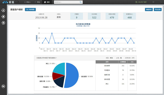 简单来说,它是一款帮助中小型企业解决客户联系人信息收集和管理问题,让企业更高效准确做市场营销的在线表单类工具 (暂只有网页版)。在麦客中,客户联系人主要由两部分组成:通过表单新增的用户和公司通过其他渠道获得的用户 (可通过导入 CSV/Excel 文件的形式导入)。表单功能主要是帮助中小企业解决收集信息难的问题,麦客提供了从表单的制作到之后的数据分析等常规功能,而每个表单收集回的信息都会自动添加到联系人中,并会按照标签 (比如:36氪开放日志愿者) 自动分组,通过这种方式来解决客户信息管理问题 (重复的联系人信息可以自动过滤)。麦客暂时以表单功能为主,未来还会加入对邮件、微博、短信等多个营销渠道的支持,以满足营销人员针对不同客户联系人进行有针对营销活动的需求。