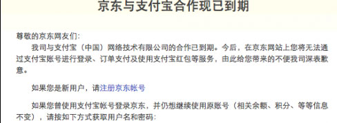 尽管在2011年京东就已经停用了支付宝作为自家的支付渠道,不过,用户仍旧可通过支付宝账号登陆京东,但是现在连这最后的一点联系也被抹杀殆尽:在用户选择支付宝登陆时,会弹出一个“京东与支付宝合作现已到期”的提示页面,明确表示在京东网站上将无法通过支付宝账号进行登录、订单支付及使用支付宝红包等服务。