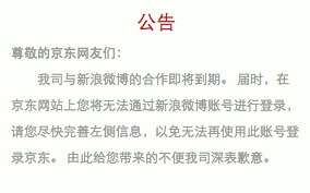而最重要的是,对于阿里大手笔纳入自家阵营的新浪微博,京东也给予了一视同仁的待遇:用新浪微博登陆京东同样会出现“我司和新浪微博的合作即将到期”的提示框,并在醒目的位置要求用户重新开设账号。