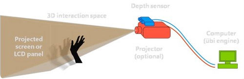 Ubi 的运行原理也很简单,配合投影仪,利用 Kinect 的动作跟踪和深度捕捉相机,Ubi 可以探知并捕捉用户在平面上的手势操作动作,包括点击、滑动和轻敲等,在获得所捕捉的数据后,运行在 Windows PC 上的 Ubi 软件会将这些手势操作反馈到平面上并显示出来,效果和在真触控屏或电子白板上的操作效果没有多大差异。这样一来,用户不要鼠标就可以在任何墙面上进行游戏、网页和 PPT 等触控操作了。Ubi软件支持即插即用。