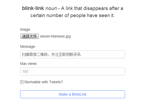 任何人都可以制作这样一个“阅后即焚”的页面,如下图示。上传一张照片,附上说明文字、设置阅读数量即可。当然还可以设置是否开启复活,通过分享到Twitter网站的方式来增加阅读数。
