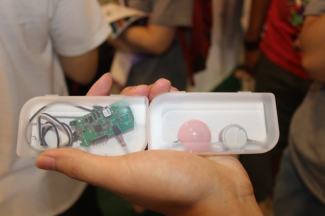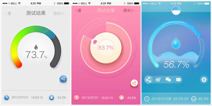 直男可能很难理解女生对皮肤含水量的着迷程度,其实大部分女性护肤主要是看两样,一是保湿,二是美白。微蜜这款产品就是瞄准前者。它是一款体积小巧的手机配件,外观特意设计成和珠宝类似,迎合女性的审美。用的时候通过耳机接口同手机相连,然后把微蜜贴到脸上,几秒后就能测出皮肤含水量,结果会显示到手机上的配套应用中。