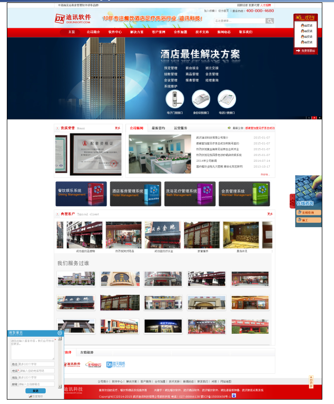 目前,公司推出了酒店管理系统,餐饮管理系统,桑拿管理系统,足浴管理系统,会员营销管理系统,仓库管理系统,员工绩效系统,连锁酒店管理系统,远程查询系统,财务分析系统等一系列成熟管理软件。经过多年的积累,公司拥有一批优秀的软件开发、网络工程、企业管理、财务管理、市场营销的人才。具有丰富的酒店、餐饮等娱乐行业管理系统开发和实施经验,在软件开发和系统集成方面能为客户提供一流的技术支持和服务。凭借良好的现代企业运行机制,“管理+软件”和“以人为本”的发展理念,形成了一整套从销售到培训再到维护的一条龙服务体系。