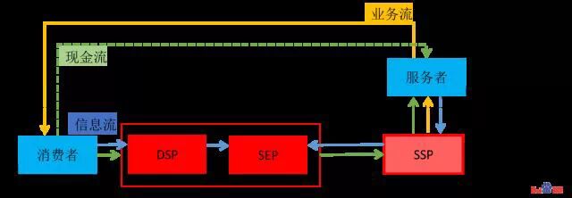 这是传统家政中介公司,该模式中有三个实体参与方:消费者、传统家政公司(同时具有DSP、SEP和SSP的职能)和服务者。 图 中用蓝色箭头标出了信息流的流向(其实质包括消费者的需求信息流和服务者的供给信息流);用绿色箭头标出了资金的流向(后文会用到实线表示主要的资金流 向,虚线表示个别的资金流向);用黄色箭头标出了业务执行的流向(包括从中介公司到服务者的业务指令和服务者到消费者的服务送达与执行)。