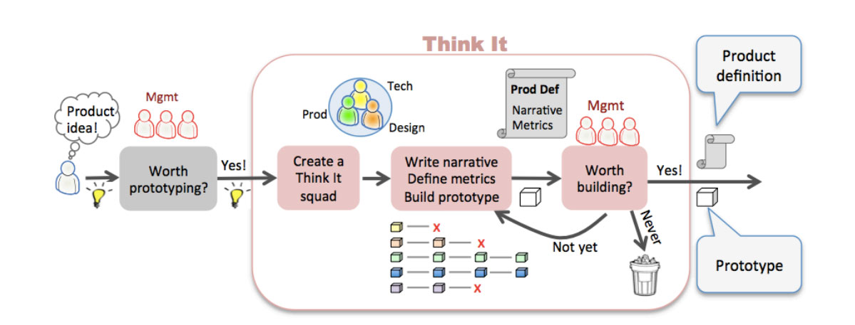 如果管理者也认为这个想法是值得付诸实践的,那么一个小型的“Think It”squad随即成立。典型的“Think It”squad一般包括一个开发者,一个设计师和一个产品经理。他们的工作就是去完善产品描述,同时构建一个足够吸引人的产品原型。