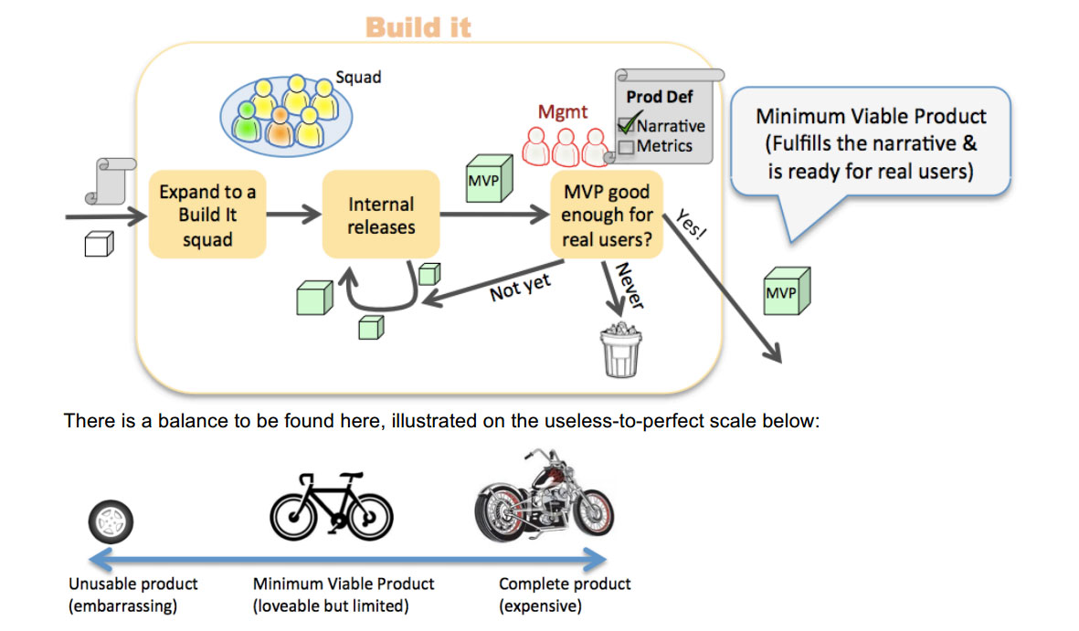 在这时,Think It squad开始扩张,以组建一个更加长时间存在的squad(有时是好几个squad),这个squad具备开发、测试、发布一个真实产品的所有需要的能力,这个squad会长期负责这个产品,不仅仅是在Build It这个阶段。