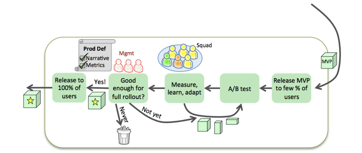 当管理者和squad共同认为产品正在小范围的用户群中发挥预期的效果,我们就可以逐渐地在更多的用户中铺开产品,同时仍旧需要做数据监测和产品提升。这可以给我们时间去处理一些业务方面的事物,例如硬盘容量,监测,脚本部署,扩展性等等。