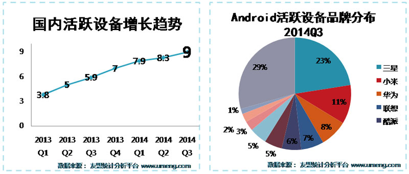 第三季度活跃设备的增长主要来源于 Android 设备的增加,包括 4G Android 设备的换代。其中小米的出货量在 Q3 已经超过了三星,但是总的活跃设备数量三星仍然具有明显的优势,下面是中华酷联组成的第二梯队。苹果设备在整个移动设备中的比例不高,但是随着两款新 iPhone 和两款新 iPad 的发布,iOS 设备增长将在第四季度发力。