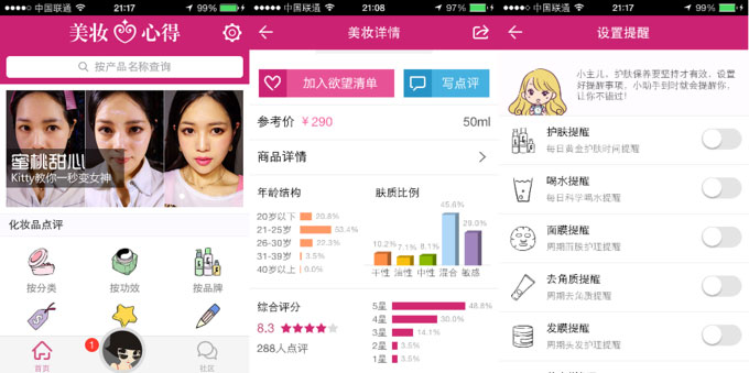美妆心得今年 2 月正式上线,10 个月来在基本没有付费推广的前提下做到 200 万用户,目前已经和雅诗兰黛、欧莱雅等品牌商达成合作。在最新上线的一个版本中,美妆心得将活动、护肤提醒、欲望清单(收藏)、肤质测试、批号查询等功能整合在了一个名叫“美小星”的虚拟人物中。通过一系列工具,美妆心得希望成为用户的化妆品助手,未来还会推出化妆品管理功能。