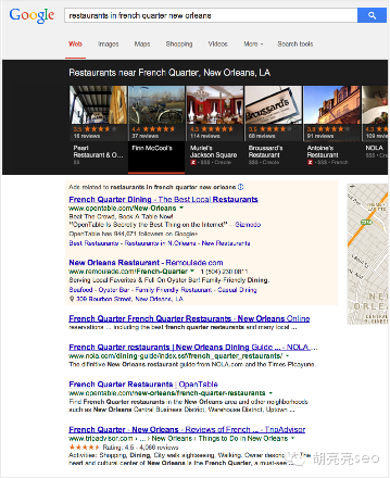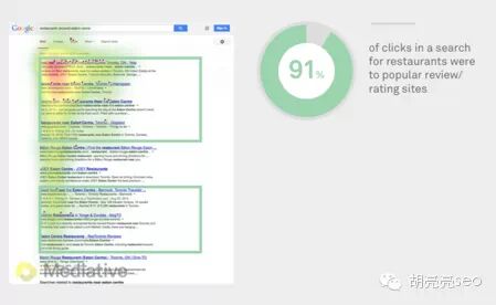 胡亮亮SEO的观点:在SEO的关键词策略里面,不一定要争top1的排名,这里给一个普遍性的SEO关键词策略建议 a top1的词选词以品牌词和高性价比词为主要对象(这个是SEO最核心最易做的词)。 b 选出top4的自然结果关键词,主要是通用类,导航类的词(最难的词,长期才见效)。 c 重点需要做到top10的信息类关键词,这类应该是很多网站需要重点去做的地方。 这三类词进行筛选分类后,对应的SEO策略就应该不难得出。 a 产品内容,关键词设置和首页外链,即可容易达成a类词。 b 外链锚文本为主,要做好这一类词还需要a和c类词的帮助,所以请先考虑c策略。 c 以内容,内链,更新等为主,这类词提升后,对b策略来说就容易多了。 E 含有作者,评论,星级评定的SEO结果 1 因为谷歌在2014年8月28日去除了搜索结果页出现作者的显示规则,所以这里就不做具体的翻译和解释了,直接跳过。 2 含有评论的SEO结果 搜索示例: 你需要找地方吃饭,谷歌搜索“a restaurant near the Eaton Centre” 91%的人会点击含有“评论”的结果