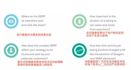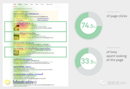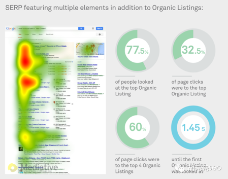 2 当搜索结果页是丰富元素的结果的时候,虽然会分散用户的注意力,但是依然不足以影响SEO自然结果的点击率。 77.5%的人会注意到自然结果, 32.5%的人点击排名第一的自然结果, 60%的人会注意到top4的自然结果 直到第一个SEO结果查看后时间是1.45秒