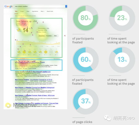胡 亮亮SEO的观点:对于百度来说,除了知心搜索,下面可能就是百度知道和百度百科,所以,这种知识类的关键词优化难度要比谷歌更高,当然,也不是没有机 会,比如一些垂直类的网站:宝宝树,寻医问药,39健康,中关村在线,onlylady,等等,这些网站的特点是内容够多,够丰富,但是也存在较多问题, 比如只有问题没有答案,或者答非所问,这也是其他的新进入网站的机会,未来一定是内容更准确,更具体,更能满足用户需求的网站才能有机会出现在更好的排名 位置,所以这里的建议依然是:纵然再难,也可以做属于自己网站的内容,这些内容,更应该专业化,高度实用化,并且是有利于品牌的,可以出现在网站重要位置 甚至是首页入口位置(而不是很多网站只开一个频道,用机器来采集内容,不断生成内容来做,而是应该更多的用智慧,用人力去作出属于自己领域的专业知识)把 内容当作品牌来做,你的SEO就更有价值,还是那句老话:是金子总会发光的。 3 谷歌知识图表如果提供相关的知识,则会对关注度有显著提升。 搜索示例: 比如你要去新奥尔良,你要查询下“New Orleans weather” 80%的人会注意到绿色结果,花费23%的时间查看这个SERP 60%的人会注意到蓝色结果,花费13%的时间查看这个SERP并有37%的页面点击