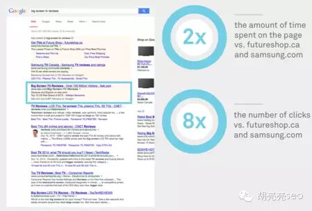 所以,SEM结果用来吸引用户的第一印象,然后用更多的排名结果比如SEO的结果来获得更多用户的关注和点击,这就是SEM+SEO的优势所在(平均一个用户看SEM的广告时间只有0.36秒) 胡 亮亮SEO的观点:预算不足的时候,做这是件事情确实很困难,但是在预算充足的时候,可不要随便挑战“SEO排名第一,为什么还要买SEM广告?”这个问 题,以上的结论就很好的说明为什么有些关键词(非品牌)是需要SEM+SEO双结果来加深你的品牌印象,吸引消费者的。对于SEO来说,如果你能把自然结 果的数量,从占领一个结果,优化到占领2条,甚至多条结果,那将会让你获得巨大的优势。