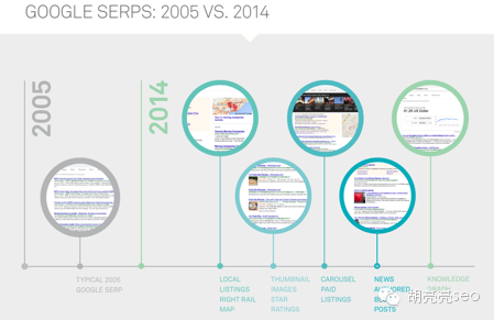 谷歌2005-2014年的搜索结果页面的变化示意图 由原来的纯文本的结果变成了现在的本地化地图+图片+付费旋转木马广告样式+新闻博客+知识图谱等丰富的图文视频等结果
