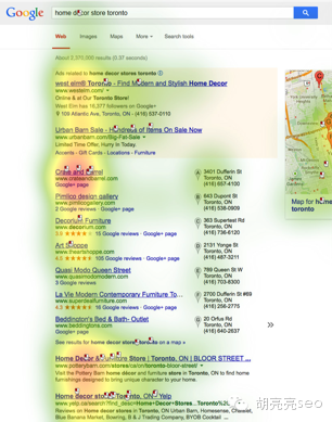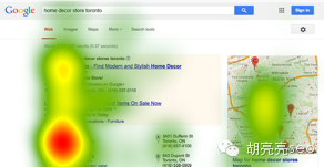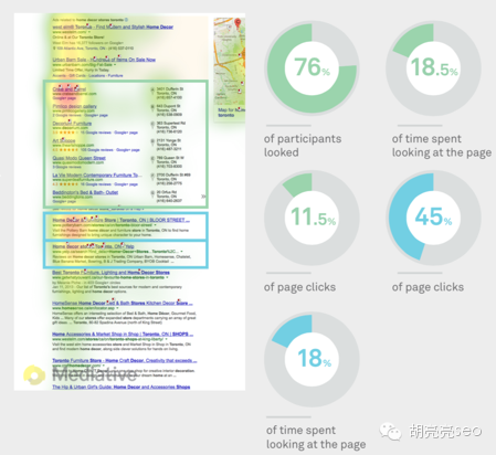 从上面的分析可以看出:你无法控制旋转木马的效果,但是你可以利用下面的自然排名结果来提高你的网站关注度,这里就包含了站内的SEO排名和站外的SEO排名,包含Google+ (图像,位置,星级)从而吸引用户点击你的结果。 C 本地列表(位置搜索) 本地列表的吸引关注度和赢得点击的能力取决于列表的所在位置和检索量请求。 1 当本地列表排名在自然结果前面的时候(上方) 假设你需要购买一些家居装饰用品,用谷歌寻找“home décor stores in Toronto” 76%的人会注意到绿色的本地列表模块结果,花费18.5%的时间浏览这个模块,吸引11.5%的页面点击 45%的人会点击蓝色的SEO结果,并吸引18%的页面点击
