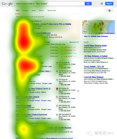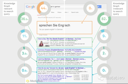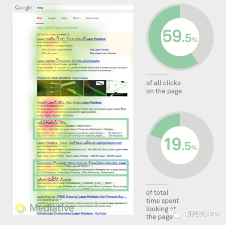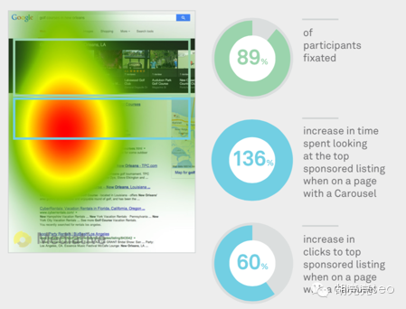 从这一点可以看出,相关的知识图表是可以把用户从自然结果那里拉过来的,甚至很多人不会去点击其他自然结果。所以,前置你的SEO结果,并保证标题和描述里使用更多的相关标记使得你的商家信息脱颖而出,可以尽可能的获得用户关注减少知识图谱带来的流量压力。 Mediative SEO集团经理 Ody Nimetz 观点认为:谷歌不会考虑知识图表对SEO流量影响多大,而是想着尽量提供用户最需要的信息和答案甚至不用离开搜索结果页面那就更好了。 胡 亮亮SEO的观点:谷歌的这个实验结果,更进一步表明:百度的知心对SEO的影响是巨大的,知心搜索里的百度Open结果对SEO流量产生很大影响,可能 很多SEOER都是苦不堪言,在商业产品如此发展的百度搜索中,除了抱怨以外,我们只能把SEO做的更好,力争排在Open结果的下面一位,从而获得更多 的关注。而对比上面两个实验结果来看,知识图谱对SEO的点击率影响,大约是82%降低到37%,最少降低50%。 所以,如果你的SEO一定要做,尽量做到第一位,要么就要考虑做这个位置的排名和你对应要付出的代价是否是你可以接受的范围内,不然,建议可以选择其他类的词。 B 旋转木马 1 虽然谷歌设计旋转木马是想提供更准确的信息,但是它不会对用户保持显著的注意力。如下图所示 89%的人会注意到绿色结果 当有旋转木马广告时,蓝色区域查看时间会有136%增幅 并且蓝色区域的点击率会有60%的增幅