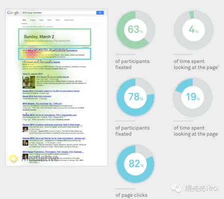 用户的眼球已经不再集中在左上了,而是会转移到更下方的位置。 2 谷歌知识图表如果提供不相关的知识,则会导致用户流失到其他SEO自然结果里。 搜索示例: 假如你要打印一份奥斯卡提名人的名单,你搜索“2014 Oscars nominees” 63%的人会注意到绿色结果,但是只花费了4%的时间看这个结果页 78%的人会注意到蓝色SEO结果,花费19%的时间查看这个结果页并获得82%的页面点击
