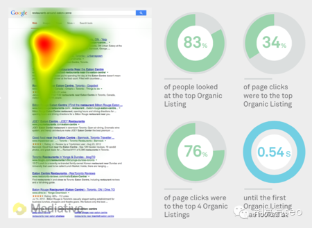 所以,结论是要加强站内的SEO优化,努力使得你的SEO目标页更精准,有用,同时你的标题,关键词标签确保是精确吻合和目标页面也是相通的。 D 纯自然结果 1当搜索结果页只有SEO结果的时候,用户关注度还是更像之前的“金三角” 83%的人注意到顶部区域第一的SEO结果 34%的点击集中在顶部区域第一的结果 76%的点击集中在top4的结果 直到第一个SEO结果查看后时间是0.54秒