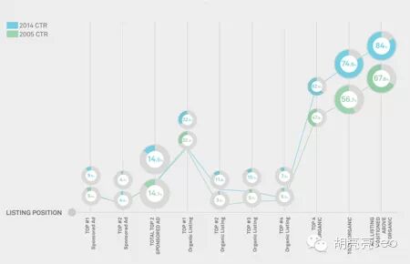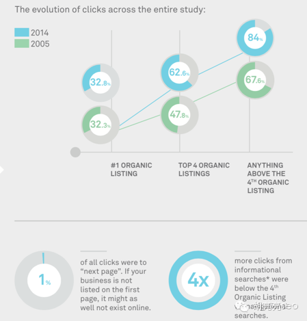 所以,结论是:SEO游戏规则还是把排名做到尽可能的靠近顶部第一! 整个研究的点击变化情况对比如图: 自然结果排名第一点击率 2005年是32.3% 2014年是32.8% 自然结果排名top 4的点击率2005年是47.8% 2014年是62.6% 任何排名在top 4前的点击率2005年是67.6% 2014年是84.0% 排名第二页以后的点击只有1% 信息类搜索需求排名第四以后也可以获得更多点击(对比通用导航类搜索而言) 所以,SEO排名第一并不是唯一选择,当需要做信息类关键词排名的时候,可以考虑把你的更多精力放在排名第四以后,当然,半数以上的时候,我们保持top4以上的排名。