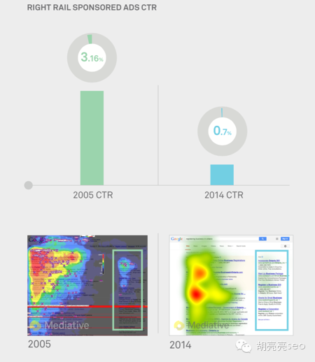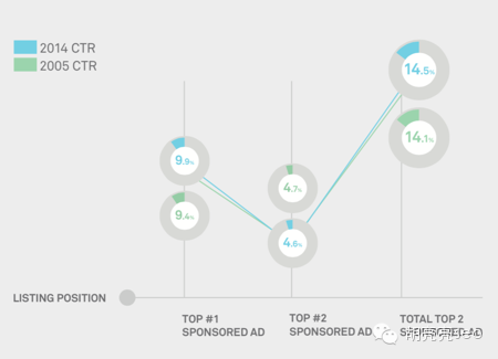 2右侧的文字连接广告的CTR发生明显变化,05年为3.16%而2014年只有0.7%