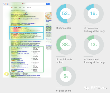 这里的实验结果还是提示:优化Google+的本地配置文件,用正确的公司名,地址,电话,星级评定等有助于确保商户信息的内容,吸引用户的关注。 2 当本地列表排名在自然结果的下方的时候 假如你要从多伦多搬到温哥华,使用谷歌搜“a moving company in Toronto” 53%的点击会集中在蓝色区域的SEO结果,并花费16%的时间浏览 38%的人会注意到绿色区域本地列表,花费30%时间浏览和产生6%的页面点击。
