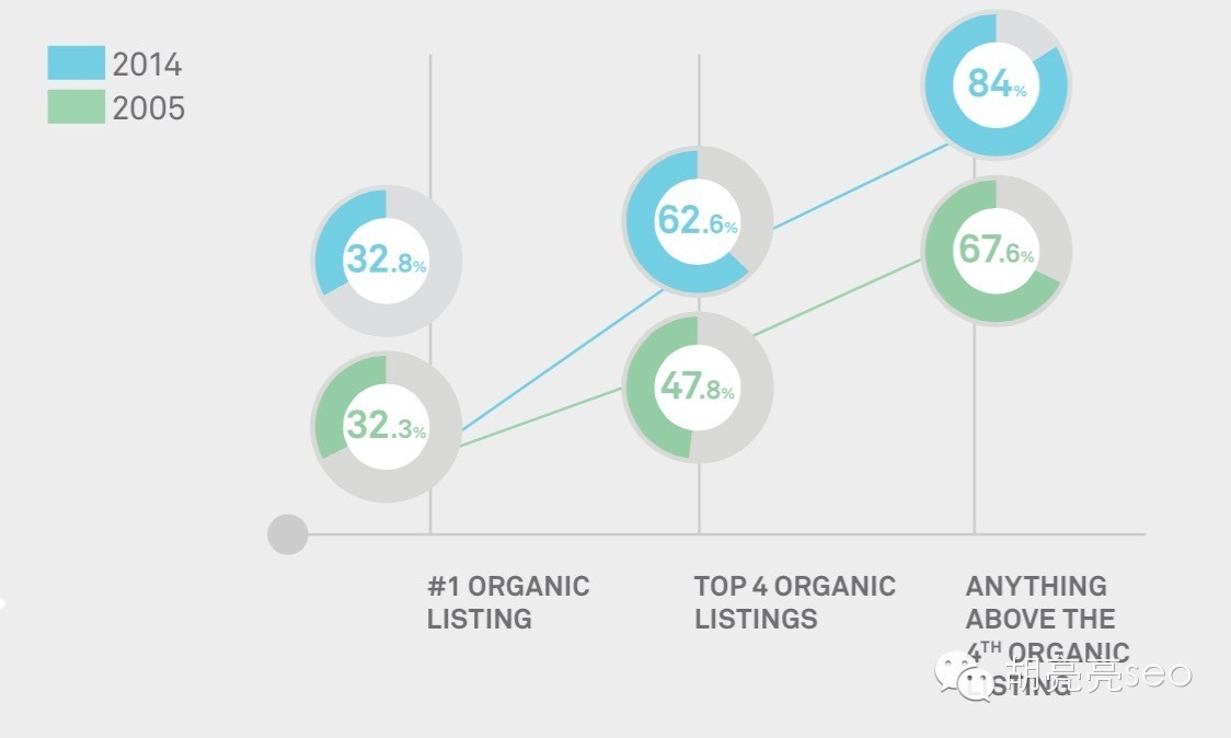 D SEM+SEO2014年与2005年的对比 主要表现是,SEO的前四有更多点击,达到62.6%,SEO的总体点击是74.6%,而所有排名前四的结果(SEM+SEO+知识图谱等)一共是84%的点击占比,所以top4是分界点和临界点。
