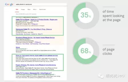 所以说,通用类导航搜索,用户是快速扫描自己熟悉和信任的品牌结果,而信息类的搜索(上例中是关于大屏电视的品牌和评价)用户更高兴去的是审查和比较网站。 胡 亮亮SEO的观点:CPC广告,其实跟SEO一样,也需要精细化操作,机器能做的事情人可以做,但是人能做的事情,机器就不一定能做,用户意图洞察这件事 情我相信机器目前还做不了,所以SEM的同学可以多看看自己的前台广告以及后台数据,结合自己的AB Test 来做一些实际的试验,相信你的SEM功力会快速提升,这比听什么大牛讲关键词账户优化,讲什么案例,讲什么技巧等实在的多,实践出真知,希望每个人都可以 得出真正属于自己的一些经验和教训,这才是属于你自己的知识和技巧。 5 付费广告+SEO相结合的非品牌搜索,付费广告提升品牌曝光和带流量到官网 搜索示例: 假如你从多伦多搬到温哥华,要装宽带电话,用谷歌找“cable phone TV Vancouver” Shaw和Rogers两个网站分别有2个广告和2个SEO结果 吸引了用户花费35%的时间去浏览这四个结果页 吸引了用户68%的页面点击量