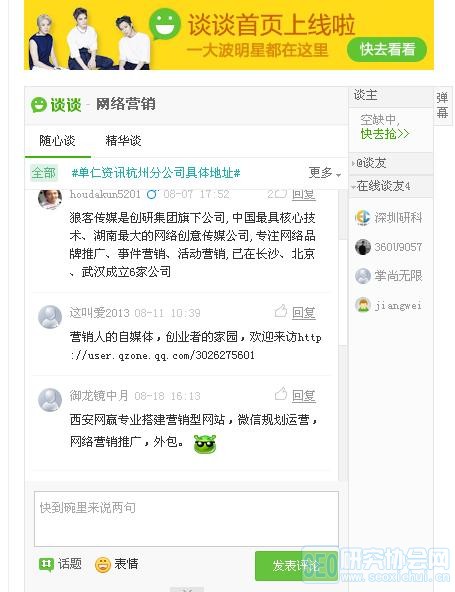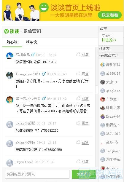 看到这里,大家应该懂了吧,在谈谈里不仅可以为自己或企业做品牌推广,也可以留下电话、QQ、微信等联系方式,至于链接,很少见,一般发了系统会自动删掉,目前我还在尝试。