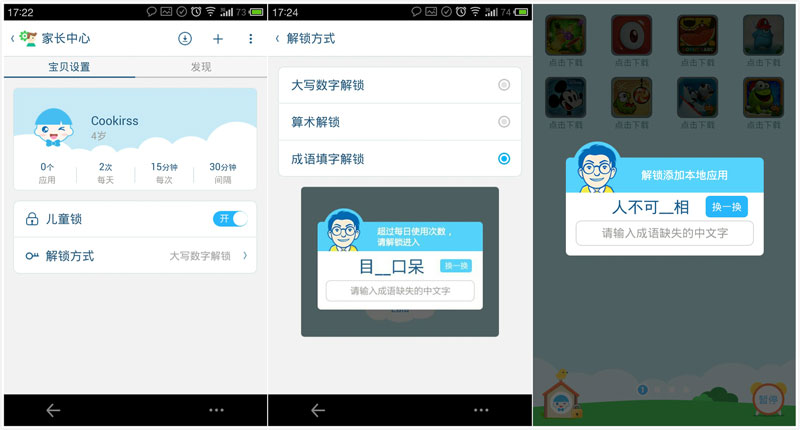 除此之外,工程师爸爸儿童桌面还拥有“儿童锁”功能,在将儿童桌面设为默认启动器之后,儿童锁可以防止孩子返回了手机原来的桌面。而在孩子尝试自行安装推荐外的应用,或是违反防沉迷规则使用手机时,这些行为会被儿童锁拒绝,需要家长解锁后才能继续使用。