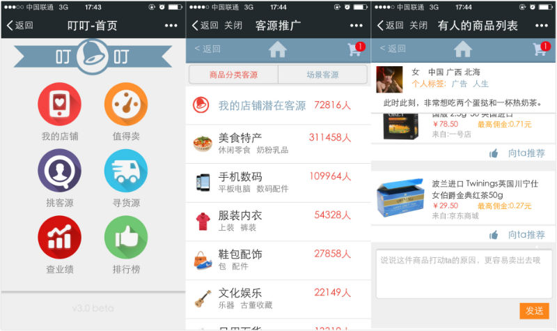 我记得之前查特价国际航班时常常会用一个叫 flychina 的网站,输入出发到达地和邮箱后,就会不断收到各种人帮助查询到的各种特价机票邮件。叮叮的货源查询和推荐渠道和这个很像,但不同的是直接在叮叮上推荐给买家就可以了,不用再通过别的方式。除了淘宝店主导入店铺外,目前叮叮还涵盖了京东、亚马逊和一号店等渠道。