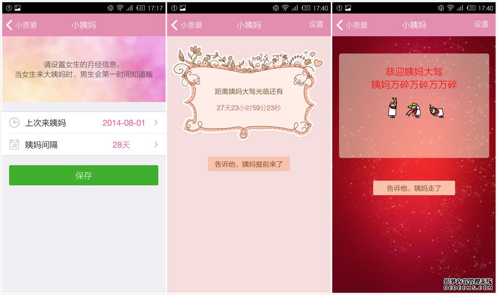 小恩爱的“小姨妈”并不是像大姨妈那样要做生理期管理或者健康助手,我感觉更像是男女的“密语”,因为除了可以帮助男生记录女孩子“不开心”的日子外,还可以让男生第一时间知道大姨妈什么时候走掉了,对于羞羞的,相处时间不太长的小情侣来说,解决了一大痛点不是吗?!