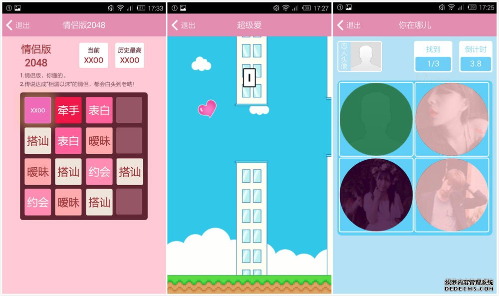 比较有意思的是情侣版 Flappy Bird 的障碍物是一幢幢房子……OMG 好写实。而 2048 应该算得上是细分化比较接地气的玩法,有些像过去情侣间玩色子的感觉,比如得到图中所示的结果,就照做之类的,你们懂得……