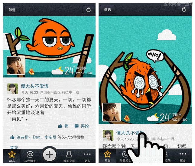 手机QQ空间推出的下拉刷新动画功能希望让用户在这个交互中,获取一些意想不到的趣味性。用户选择动画形式的背景,进行下拉的动作后,会看到背景图产生一些强烈的对比和反差,产生意外惊喜。比如被弹出去的小鸟、钓上来的小鱼。除了有趣,该功能也为商业项目提供了空间,可以植入热门电影、游戏、品牌宣传等。