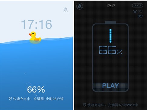 如何打破传统的信息展示方式,让新的个性化展示传达创意的乐趣?手机管家iPhone版将趣味性延伸到充电屏保上。为了改变以往充电时枯燥地展示剩余电量、充电时间等信息。手机管家提供了三个各有特色的创意充电主题:贪吃蛇、小黄鸭和夜间城市。以贪吃蛇主题为例,小蛇会在电池内部绕圈,有一种充电的走动感。当用户点击Play,就可以进入贪吃蛇游戏。小黄鸭主题中,充电时,水泡会从下方冒出,水越多,小黄鸭升得越高。利用重力感应,水还会随用户摆动手机而调整。