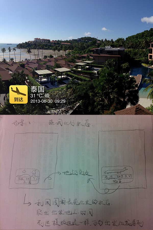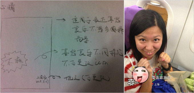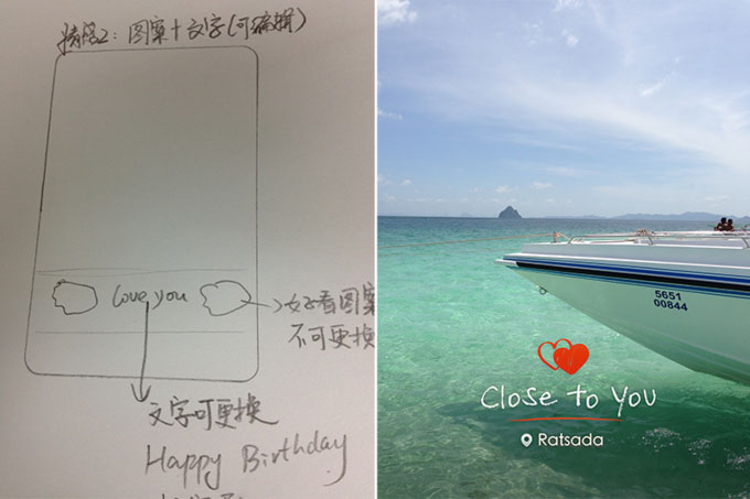 于是我们围绕用户的生活、照片分享的场景去想, 哪些模板、功能还可以应用到水印相机里面。当时我们还画了很多手绘稿。其实手机上有得天独厚的优势,比如获取到拍摄的时间、地点、城市当时的天气,甚至可以计算到分贝。我们想,如果借助手机的优势,把照片当时拍摄的周围环境的信息,或者用户想表达的这种情绪,以平面设计的水印的感觉印到相片上,也是一种微创新。所以我们也是从用户分享生活照片的行为,以及智能手机本身能提供的一些技术参数受到的启发。