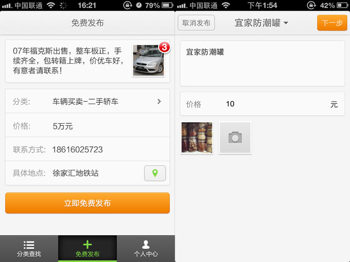 在新的 App 设计中,我们大胆的将拍照功能的优先级提到最高,减少用户的输入。除了内容和价格,其他选项全部自动化,为的就是让用户在公交车上拥挤的环境中也能顺利的发出去。同时在调研中发现用户发布信息都是即兴的,会一时无法拍照或者漏掉一些内容,我们还会定时提醒用户来补充内容,不像网站发布是一锤子买卖。