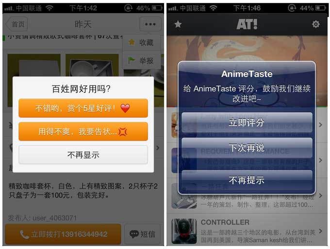 在我们的思考中,用户只有在这个产品真正帮助到他们的时候他们才会真心的愿意给你好评,如果还没有完成体验了你的产品,那么凭什么给你评价呢?另外就是如果用户遇到不爽的时候你还要别人给好评,不给一星才怪呢。