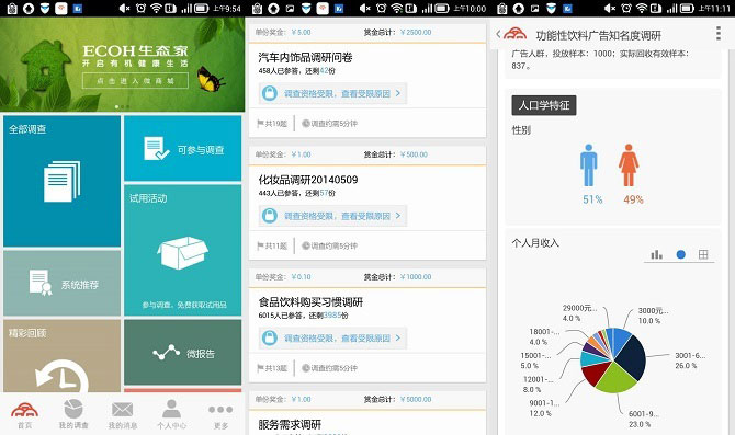 “赚零用”其实是把电脑上的调研客户端搬到手机上,方便用户做问卷题目。数据显示,线上调研的市场潜力是巨大的。因此,调研产品的发展空间很大。