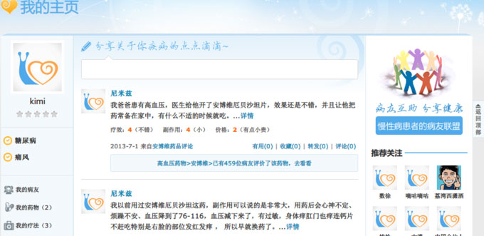 慢病友目前有包括糖尿病、痛风、胃病、乳腺癌等 4 个病友联盟(不孕不育病友联盟即将开通)。联盟内病友、病症、药物、疗法均作为主体有自己的“个人主页”,上面积累了由慢病友团队整理的以及用户分享的各类资讯和经验。改版后的慢病友则通过关注、收藏、类似新浪微博的动态流的机制,让病友能第一时间看到自己关心的资讯。假设作为一名高血压病患,我就能实时在动态流里看到我关注的病友今天都吃了哪些药、疗效如何、有何副作用、以及价格贵否。