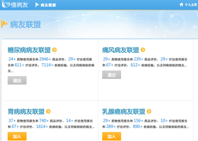 慢病友是一个病友之间经验分享的社区,病友可以在上面发布自己的患病和治疗经历,以帮助患有相同病症的人。慢病友目前有包括糖尿病、痛风、胃病、乳腺癌等6个病友联盟。