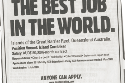 只要待在一个美丽的海岛上,清理水池,喂鱼,收收邮件,就能拿到15万美元的报酬。等等。。。世界上真有这么好的工作?没错。09年,昆士兰旅游委员会开始了招募"世界上最好工作"的活动,申请人只需要录制一段一分钟左右的自我介绍视频,便能够参与到这次选拔。共有34684人参与了此次招募活动,招募活动仅仅花费了170万美元,但在全球产生的广告效益达到1.1亿美元。