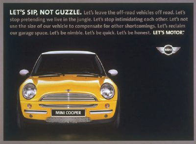 在欧洲,minicooper就像一个标签一样。但是在中意大排量、SUV的美国,这款小小的Mini少有人知道,市场占有量更是少的可怜。所以一个聪明的市场营销人员会怎么做呢?当然是强调自身的特立独行啦!