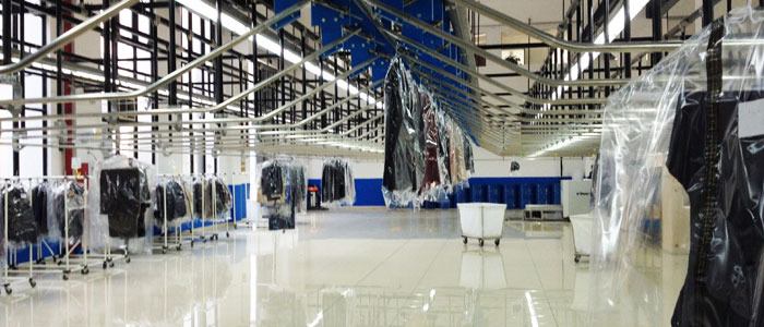 启用中央洗涤厂的目的是实现集约干洗。干洗客创始人李杰认为,集约干洗相比传统的干洗加盟店,可有效降低在店租、人力、耗材方面的成本。目前,干洗客在上海已投资近2000万建成了一家占地40亩,车间总面积2万平,日均吞吐量80吨的洗涤工厂。工厂采用分拣分区分车间、蒸汽消毒的标准化洗涤程序。