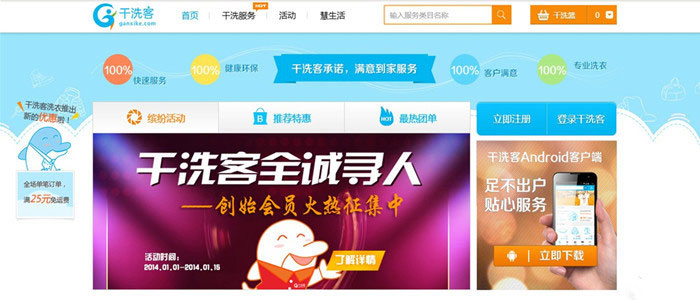 “”是2013年12月诞生于上海的网络干洗服务。用户通过干洗客网站/客户端下单后将由快递员上门取送衣物再送洗干洗客在上海的中央洗涤厂整个过程一般控制在48小时以内。服务类别不仅包括衣物,还涵盖家居、箱包、车饰等类别。